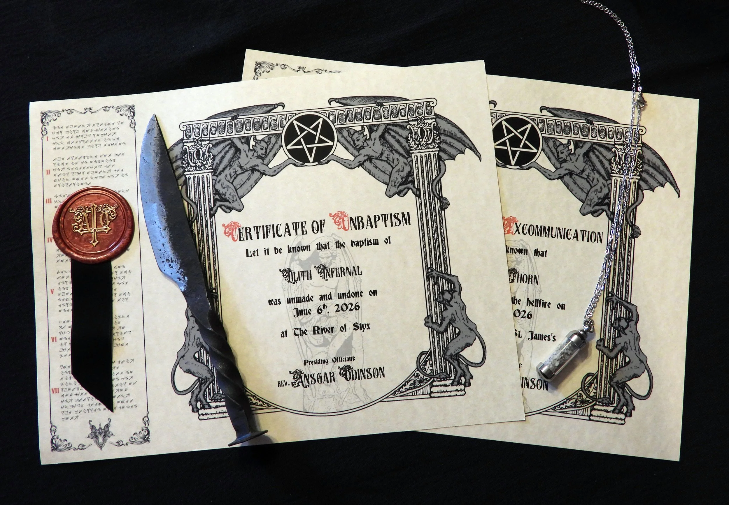 The Rite of Excommunication is for those who were never baptized, or ready to make a more dramatic statement in casting off their faith. During this ritual the participant burns a symbol of their faith and the ashes are placed in a vial to keep as a powerful symbol of their spiritual freedom.